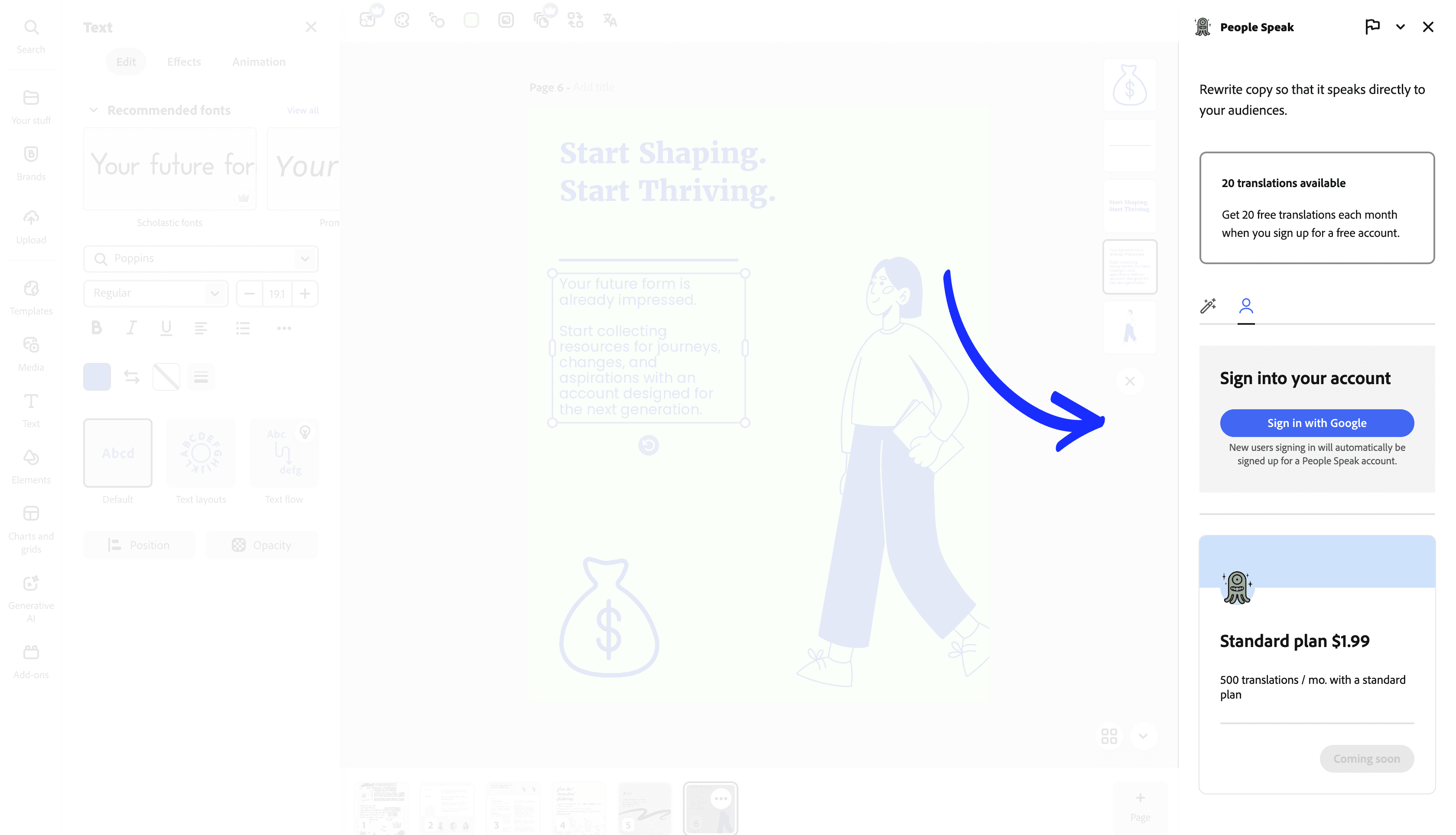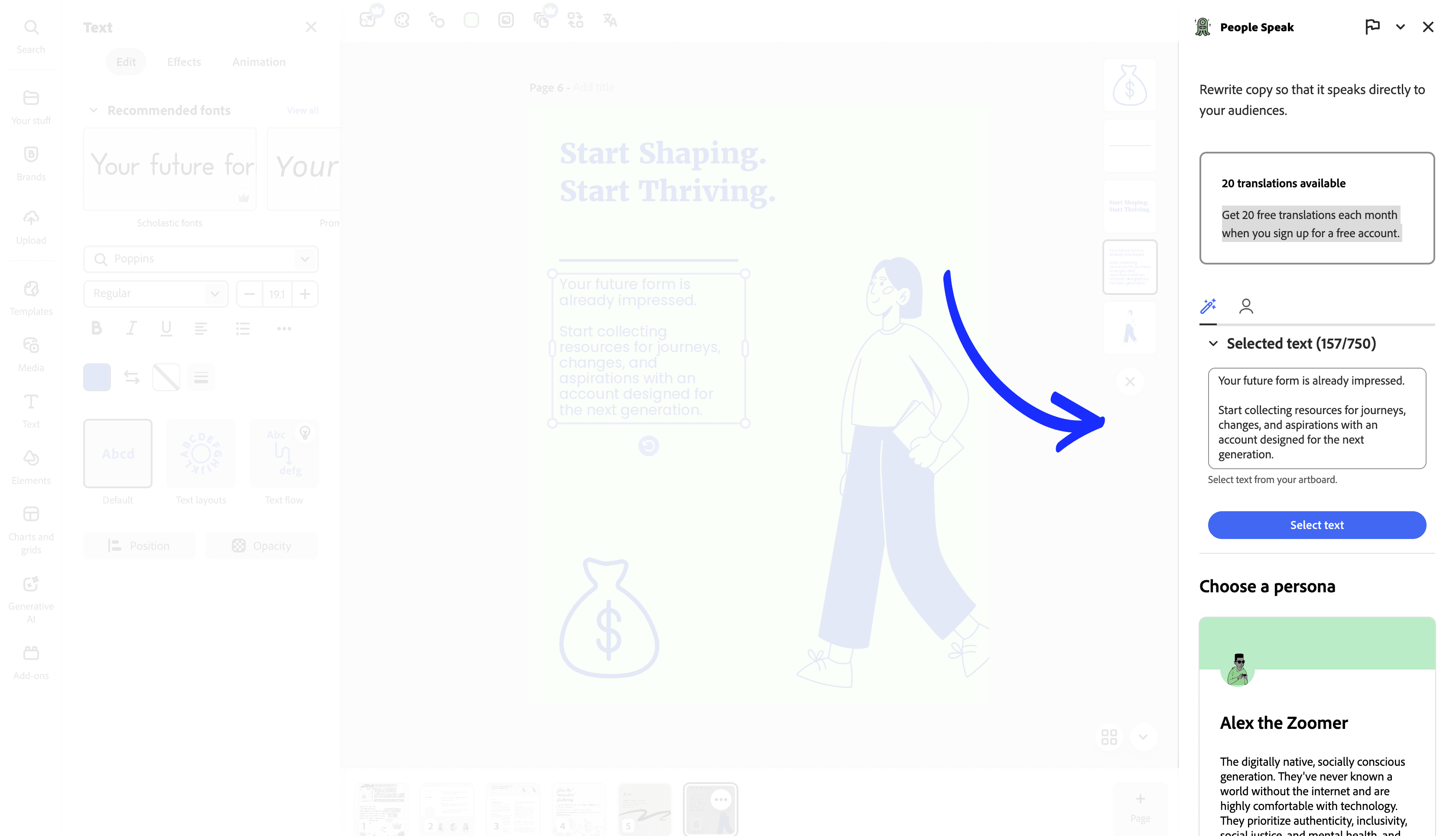 People Speak is an Adobe Express add-on I designed to help marketers generate tailored marketing copy directly in a design tool. It uses AI (chatGPT specifically) to translate text so that it "speaks" to different audiences. Users can select from a list of out-of-the-box personas, or build custom personas using their own research and analytics.